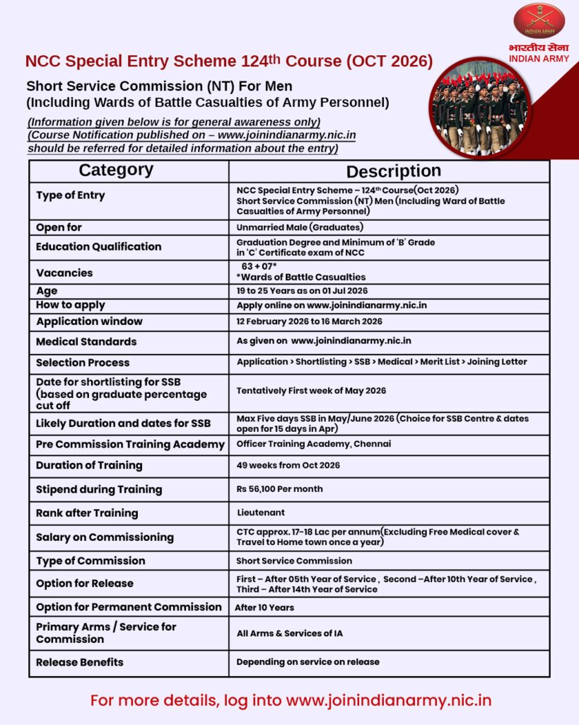 Indian Army ने NCC Special Entry 124 Course (October 2026) के लिए notification जारी किया है।