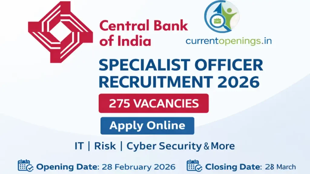 Central Bank of India has released a notification for 275 Specialist Officer vacancies across various IT, Risk, and Digital Banking streams. The recruitment includes posts from Scale I to Scale IV such as IT Officer, Cyber Security, Data Scientist, Cloud Manager, and more. The online application process starts on 28 February 2026 and closes on 23 March 2026. Selection will be based on an Online Examination and Interview. Eligible candidates with required qualifications and experience can apply online.