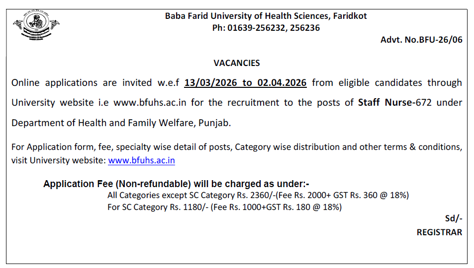 Baba Farid University of Health Sciences (BFUHS), Punjab has released a recruitment notification for Staff Nurse posts under the Department of Health and Family Welfare, Punjab. A total of 672 vacancies have been announced. Eligible candidates can apply online through the official website before the last date.